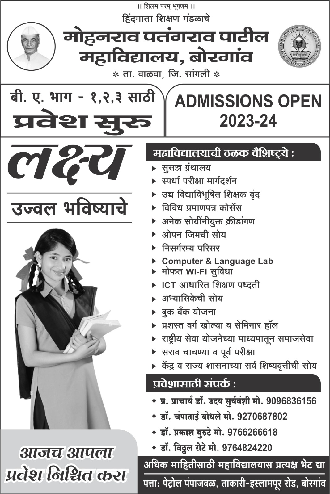 Hindmata Shikshan Mandal, Borgaon established the college, 'Mohanrao Patangrao Patil Mahavidyalaya' in the year 2001. It started with 71 students. In the last twenty-two years it has grown into centre of Higher Education at Borgaon. At present 143 students are prefacing their higher education in various subjects of their interest. This college is affiliated to the Shivaji University, Kolhapur in June 2012. The college is included under the sections of 2(f) & 12 (B) of UGC Act 1956 in Feb. 2013. Internet, Computer, Library and Reading room facilities are available in the college. The college provides higher education in Arts to the underprivileged students in Borgaon as well as surrounding rural areas.